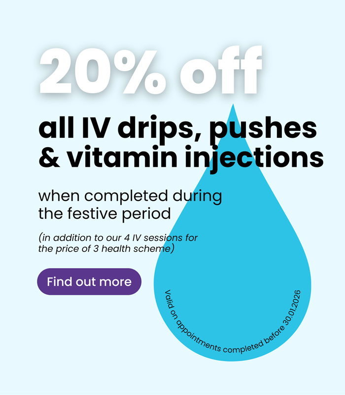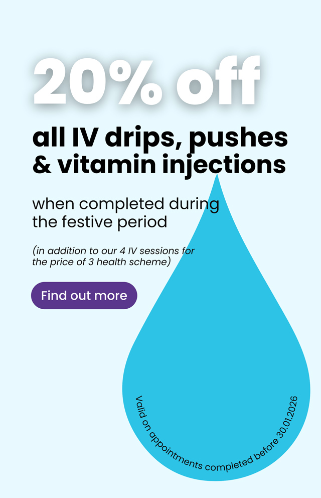 Get 20% off IV drips, pushes, and vitamin injections during the festive period. Valid on all appointments completed before 30.01.2026. This offer is in addition to our existing 4 IV sessions for the price of 3 health scheme.